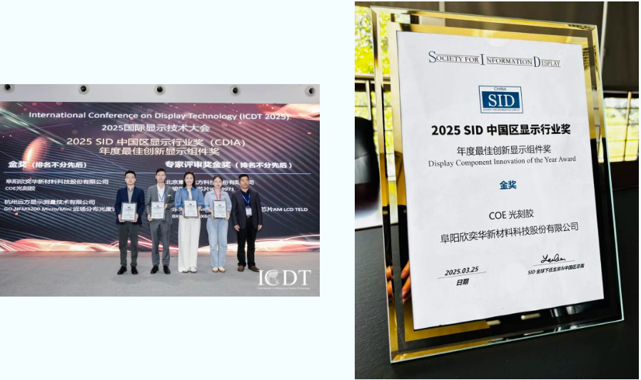 欣奕華材料作為國內(nèi)光刻膠頭部企業(yè),攜創(chuàng)新成果COE光刻膠產(chǎn)品在近百項(xiàng)參評產(chǎn)品中,斬獲由SID頒發(fā)的中國區(qū)顯示行業(yè)獎(CDIA)年度最佳創(chuàng)新顯示組件獎——金獎。該獎項(xiàng)由行業(yè)專家組共同參照“新穎性、開創(chuàng)性、商業(yè)價值、技術(shù)突破”等多重標(biāo)準(zhǔn)進(jìn)行評審,是顯示行業(yè)最具影響力的獎項(xiàng)之一。獲評該獎項(xiàng)再次印證公司新技術(shù)產(chǎn)品創(chuàng)新能力,尤其是在光刻膠領(lǐng)域的非凡實(shí)力。