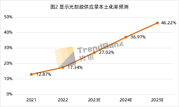 根據(jù)勢銀(TrendBank)調(diào)研數(shù)據(jù)顯示,在國家與企業(yè)層面大力推行國產(chǎn)化的背景下,中國大陸顯示光刻膠的本土化率仍有很大增長空間,企業(yè)對未來3年內(nèi)發(fā)展普遍看好,預(yù)計2021-2025年顯示光刻膠本土化率由12.87%上升至46.22%,平均每年提升8.3個百分點。